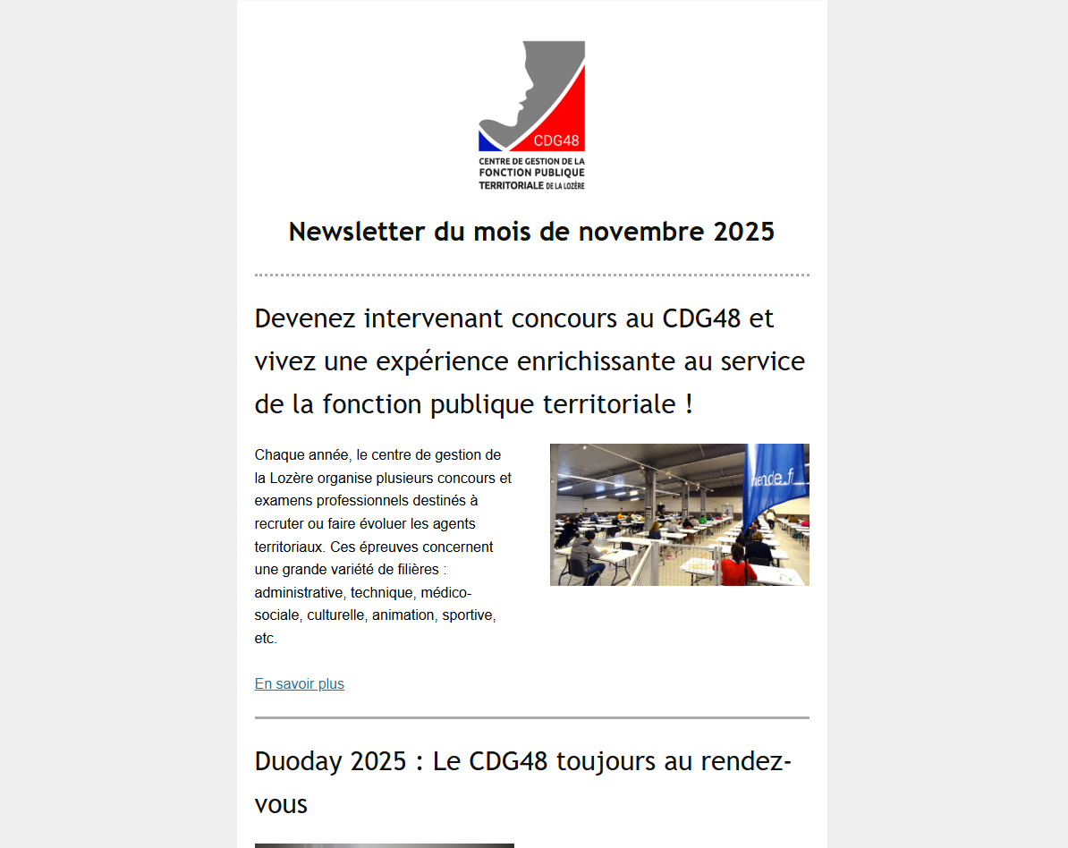 Offre d’emploi, résultats de concours, informations sur les évolutions réglementaires et législatives de la fonction publique territoriale, actualités et évènements au Centre de gestion, recevez chaque mois le récapitulatif de toute l’information diffusée par le CDG48 dans votre boite mail !
